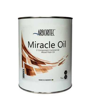 Arboritec Miracle Oil — 2-х компонентное масло для деревянных полов с 100% сухим остатком. Масло проникая в древесину, создаёт прочное, матовое, равномерно окрашенное финишное покрытие, способное выдерживать высокий износ. Доступно в 6 цветах: натуральный, белый, серый, коричневый, красно-коричневый и чёрный. Подходит для всех пород древесины. При необходимости может использоваться в качестве тонирующего масла под лак Arboritec CompoAvenue. Наносится в 1 слой.